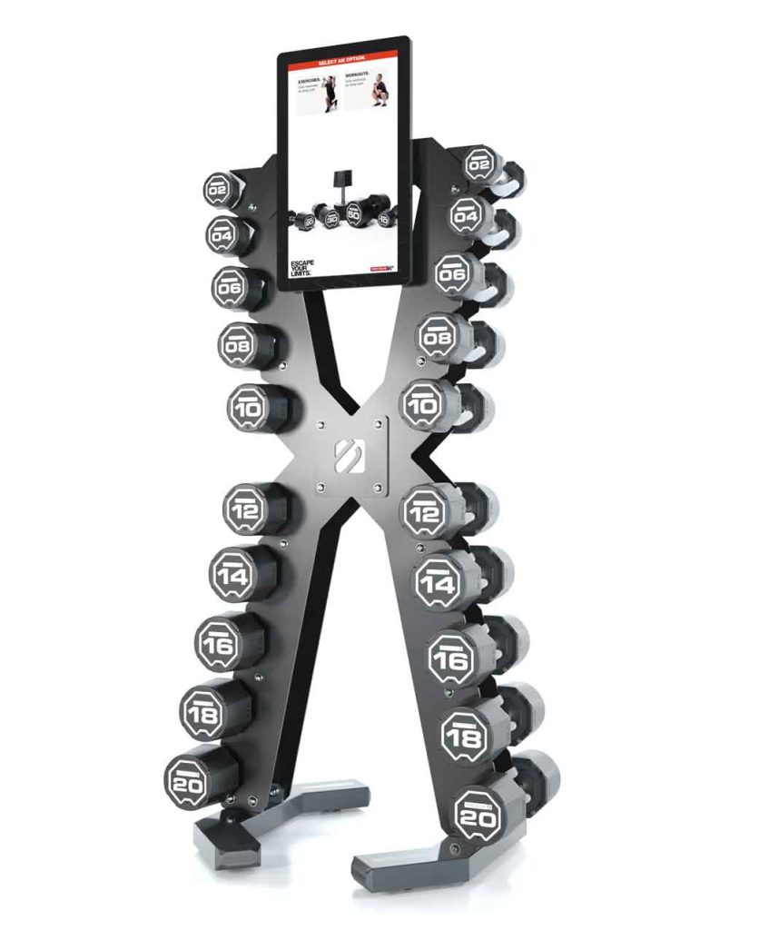 Every exercise is brought to life by a video demonstration and training tips to help users optimise each and every rep. Couple this advanced coaching aid with Escape’s unique space-saving XRACK, housing 10 pairs of Nucleus Dumbbells and say hello to the next generation strength training pod.