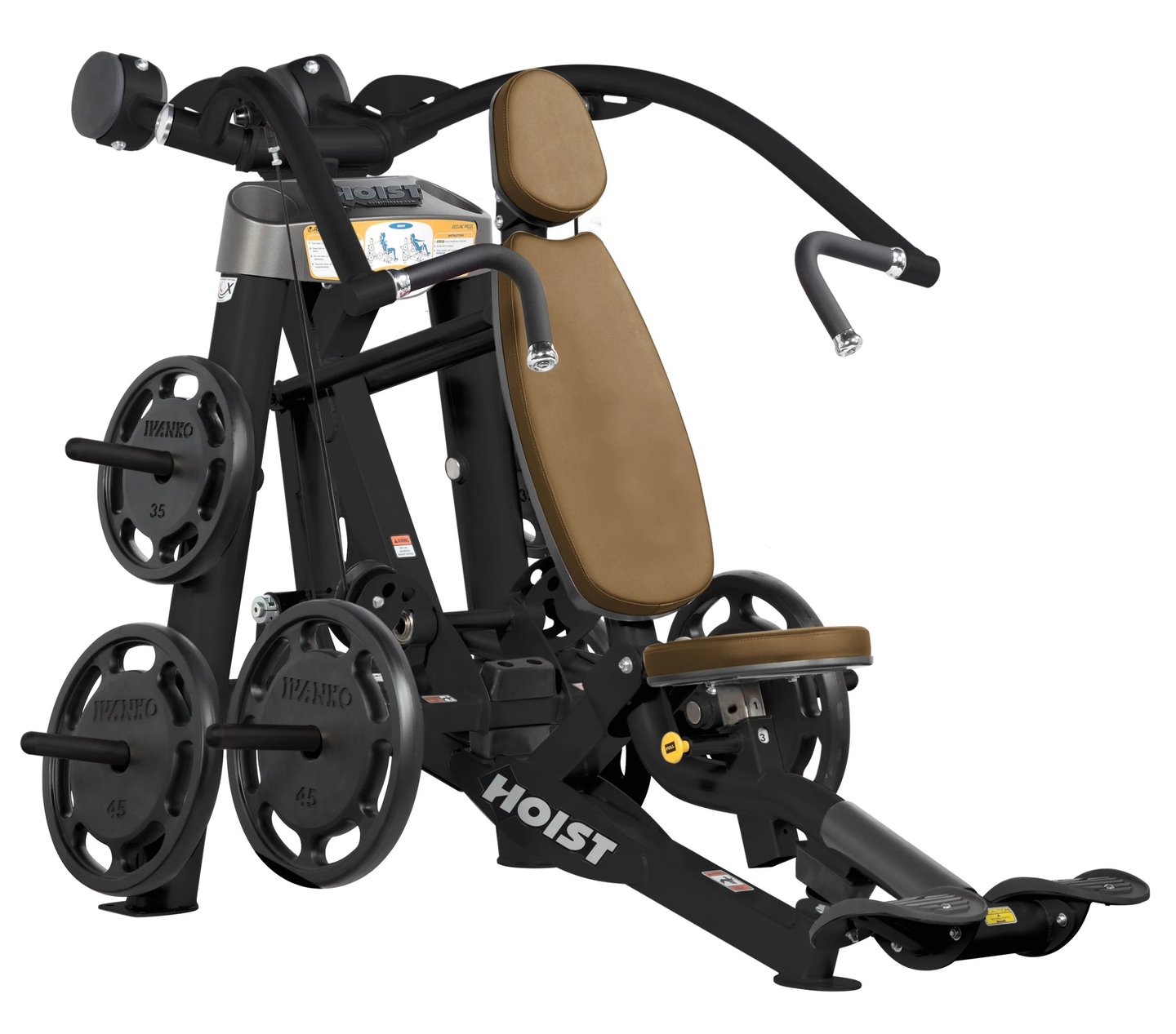 The HOIST® Incline Chest Press with innovative ROX™ technology puts work out enthusiasts in a secure and comfortable position from start to finish for engaging, targeted upper chest exercises. This unit aligns the user with the press arms at chest level, then rocks backwards replicating the movement of an incline chest press providing a more stable and ergonomically correct posture than can be established with free weights. Independent, converging press arms are counter-balanced to provide a natural motion, minimizing stress to the anterior shoulder capsule and allowing for a low starting weight. Contoured press arm handles provide multiple grip positions for users of all sizes. Generous built-in weight storage make it easy for work out enthusiasts to quickly add plates to the machine, while keeping your gym or workout facility tidy and saving space.